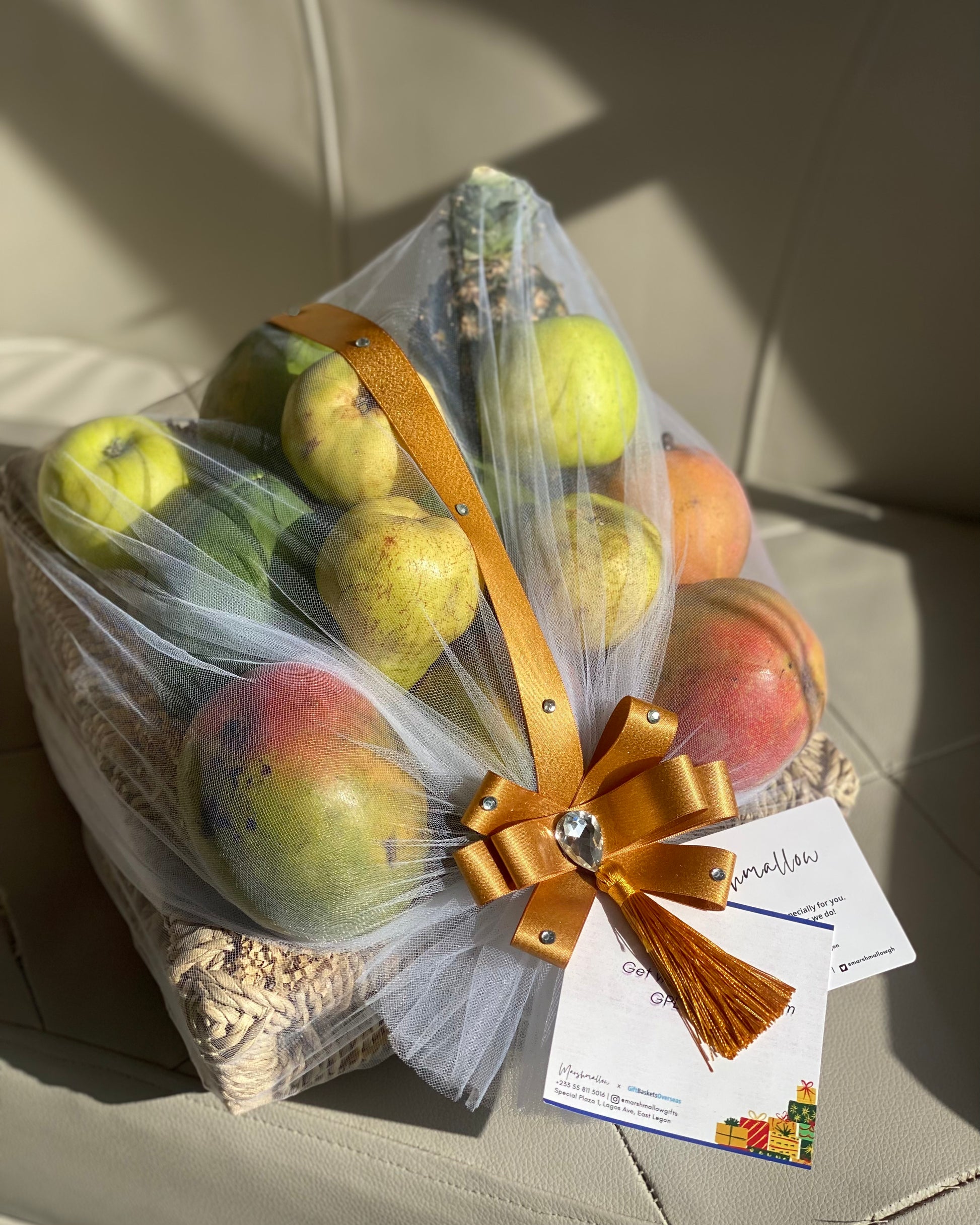 Contains assorted fruits in a gift basket