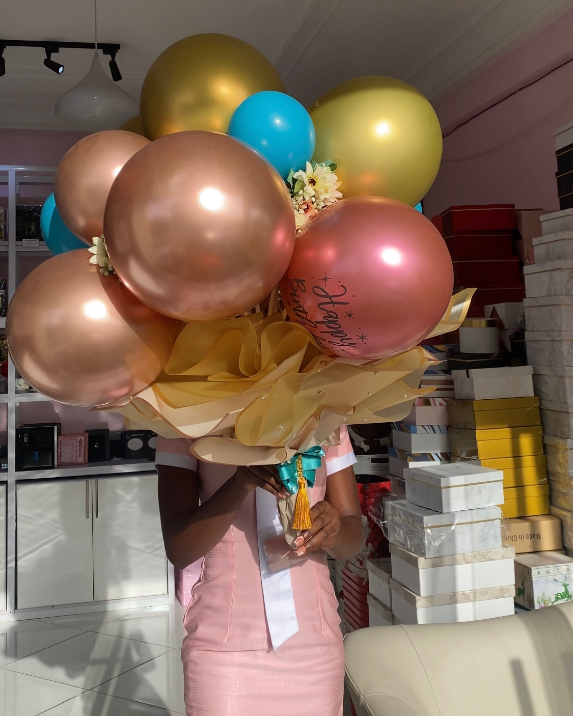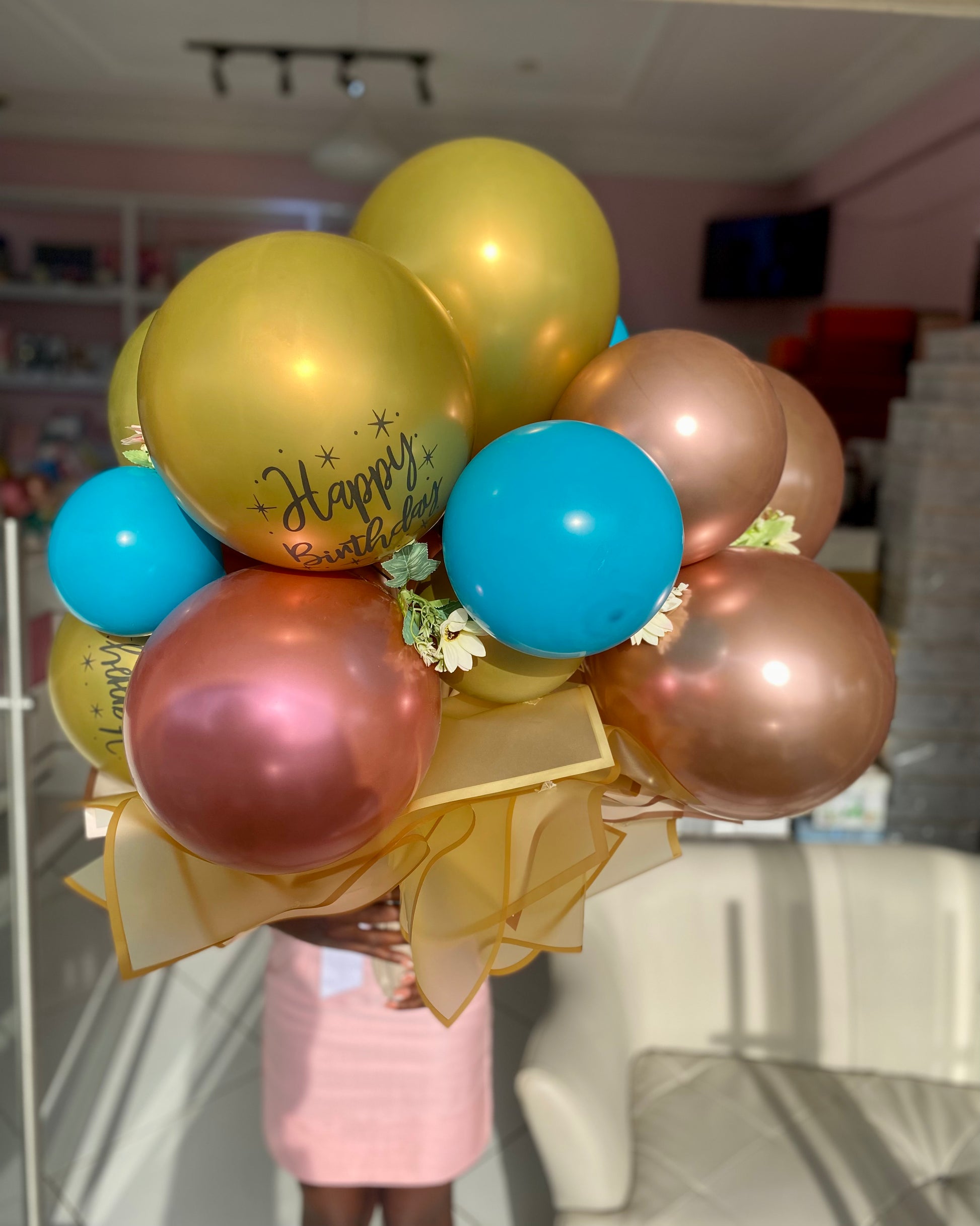 A bouquet filled with multiple colors of latex balloons and artificial flowers. Delivery only available within Accra