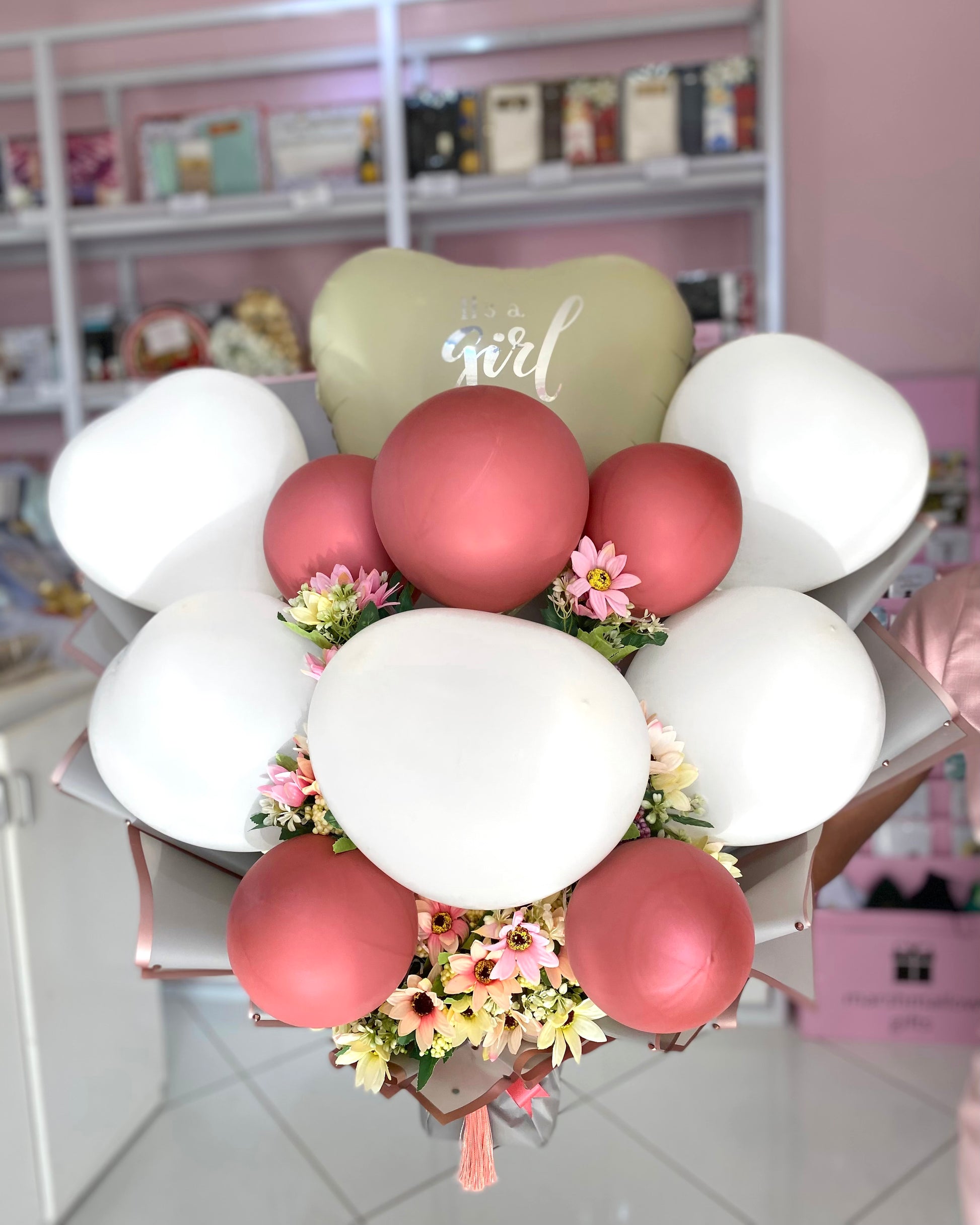 A bouquet filled with foil balloons, latex balloons and artificial flowers. Delivery only available within Accra