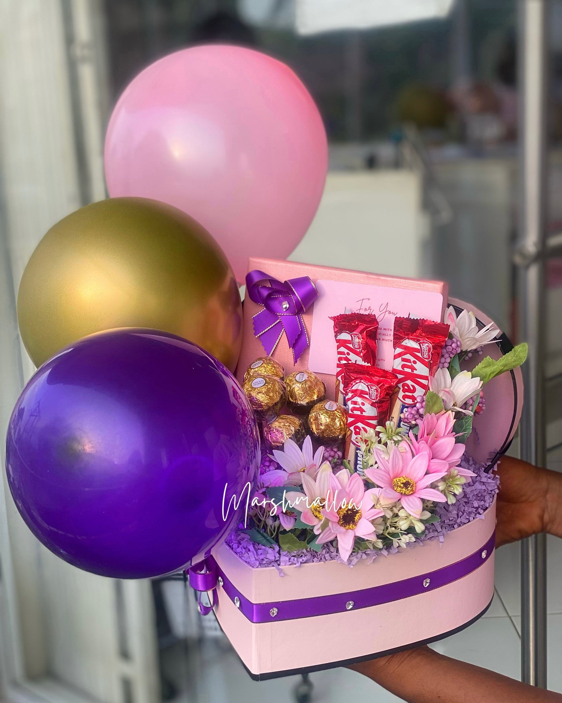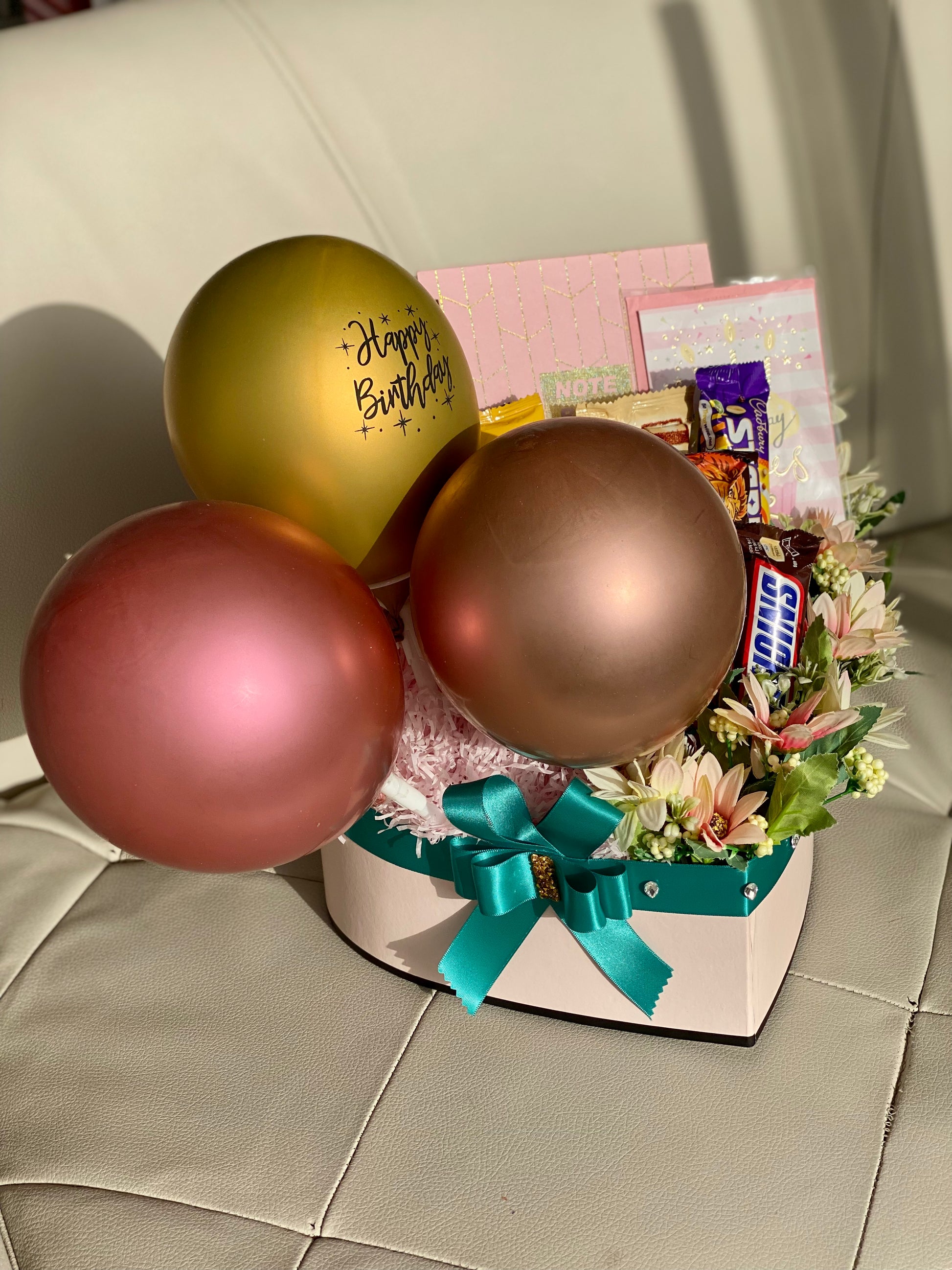 A box filled with chocolates, a notebook, latex balloons and artificial flowers.