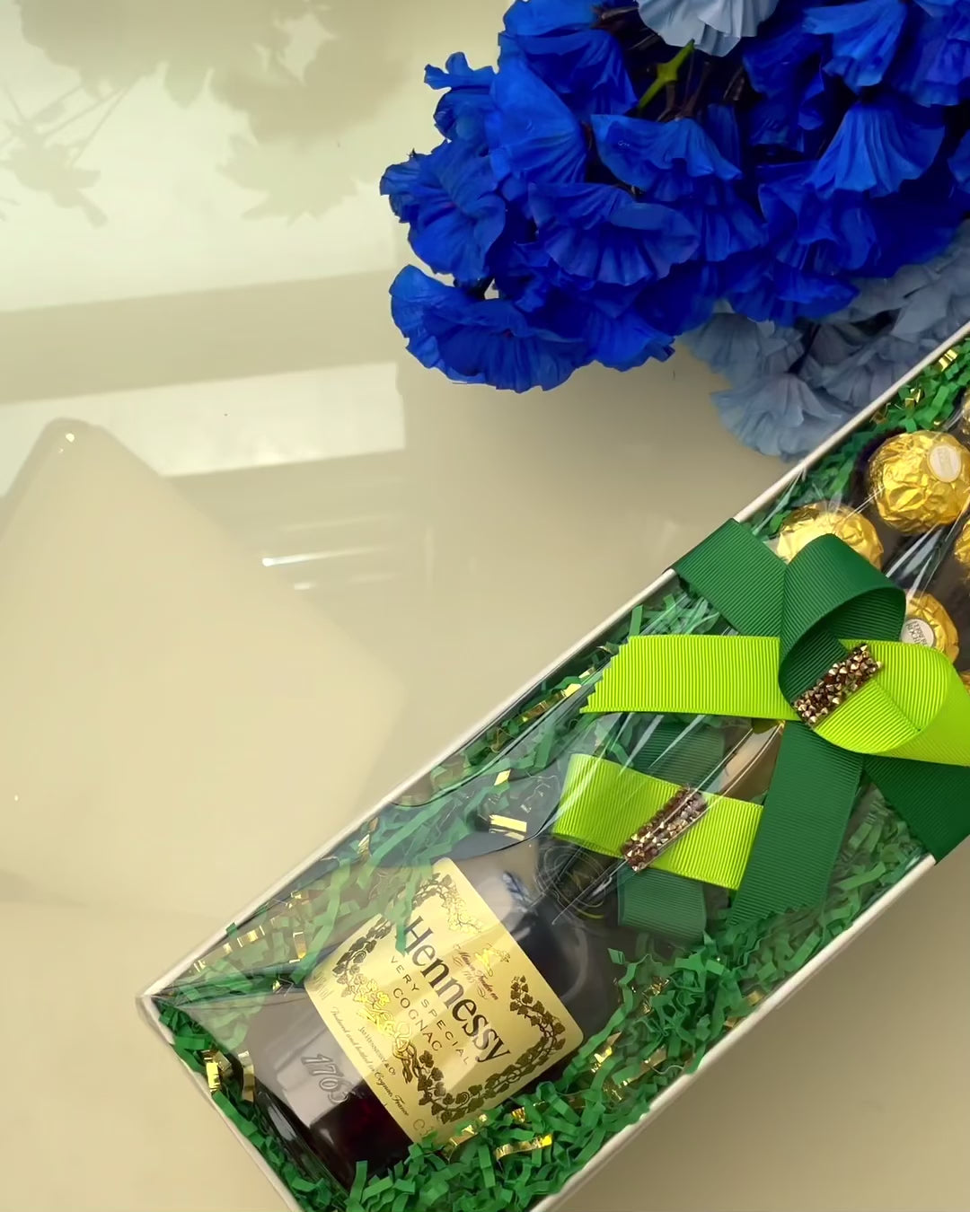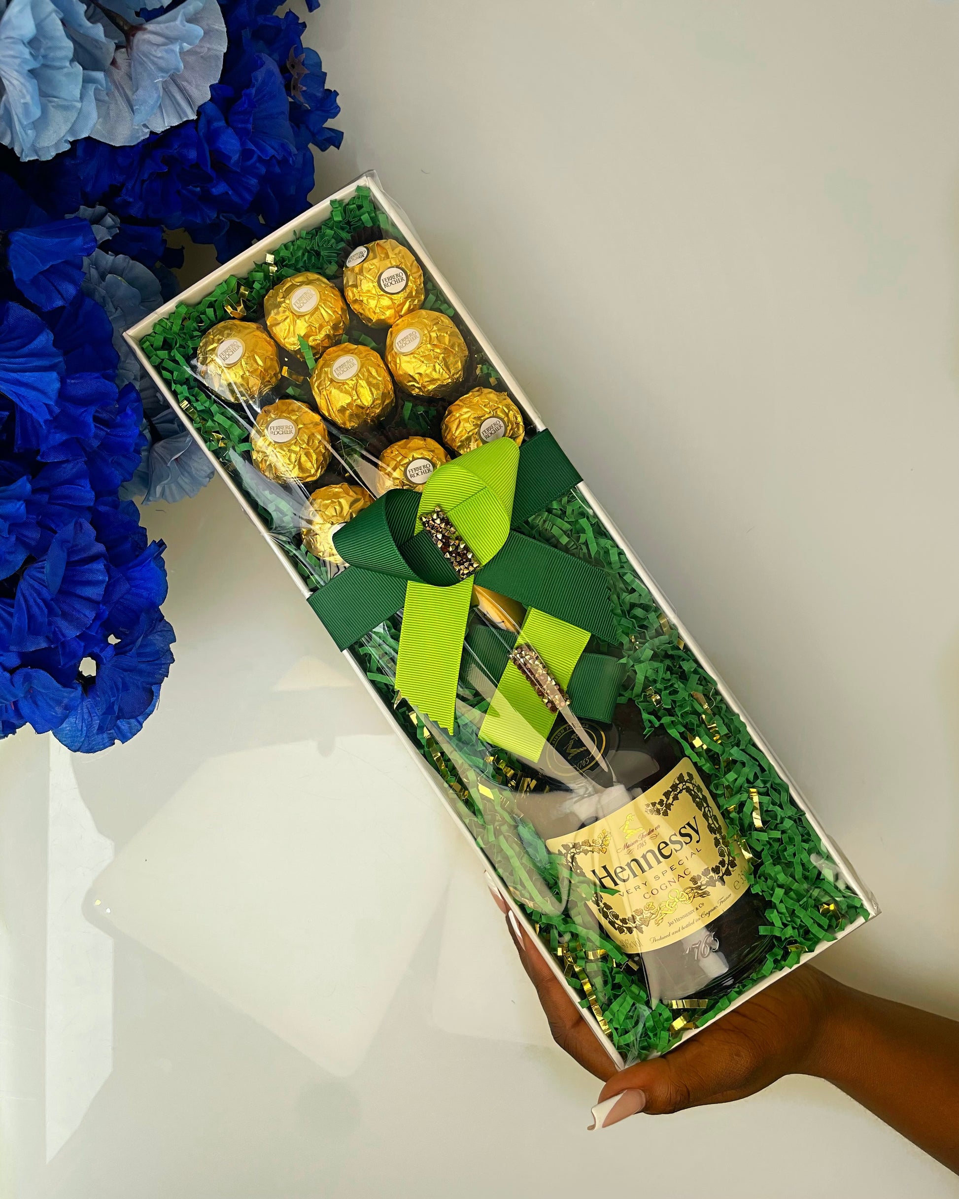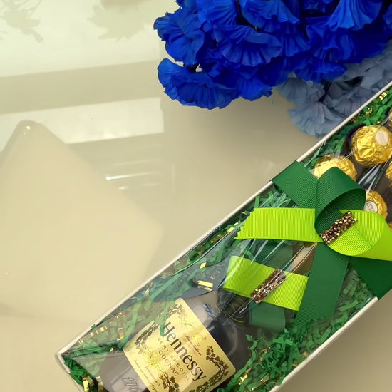 Indulge in our luxurious Regal Box! Featuring the rich flavors of Hennessy whiskey and Ferrero chocolate, this set is perfect for treating someone special. Elevate any occasion with this elegant and delicious combination.