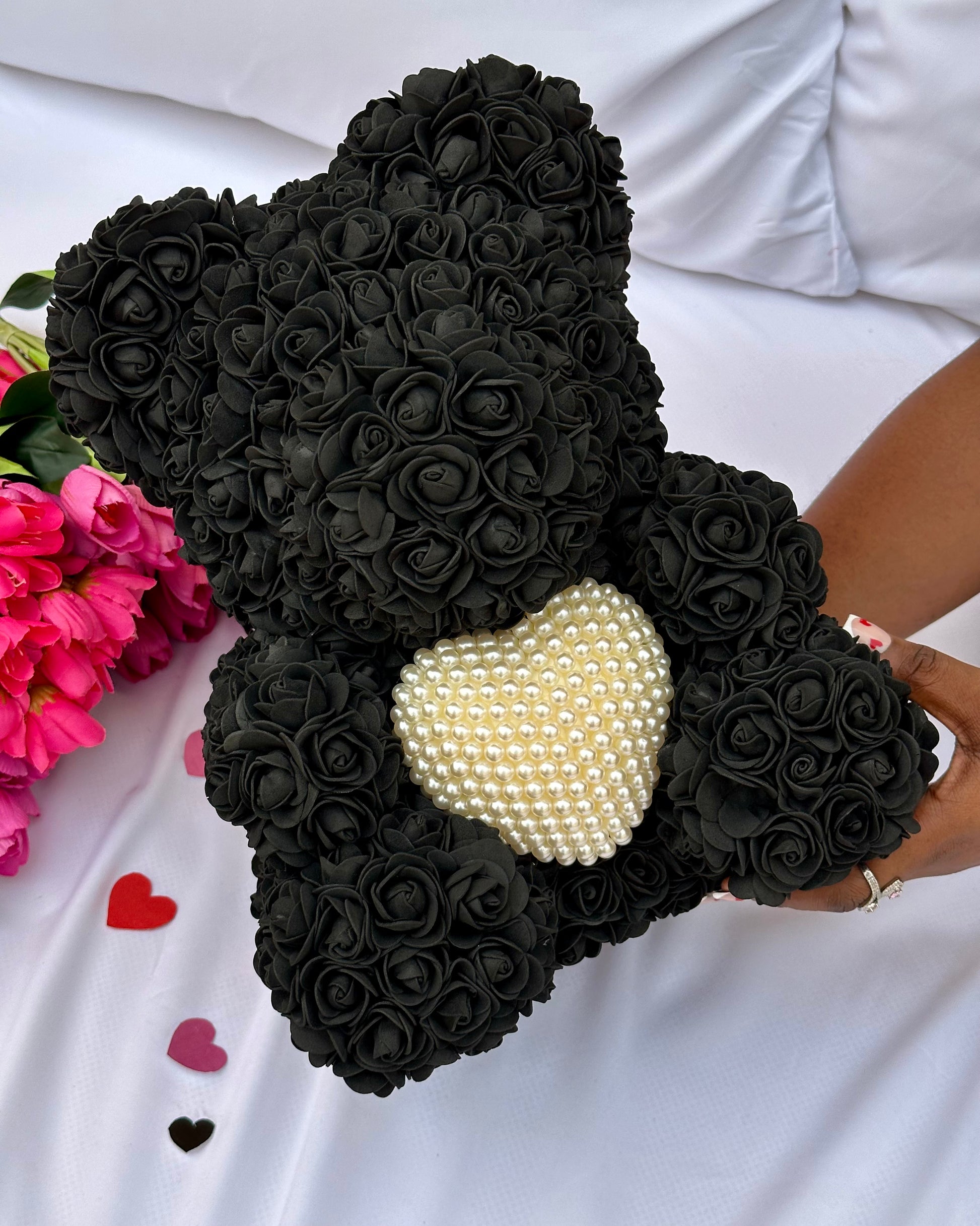 Our signature Rose Teddy Bear, delicately crafted with roses and a pearl heart.
